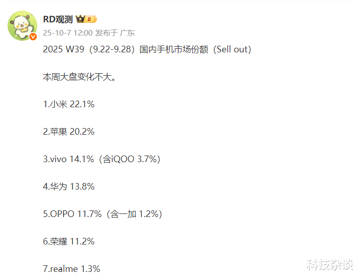 这份数据是来自行业人士“RD观测”,虽然相对正常时间有点晚,但也在假期之间给行业提供报讨论的话题。数据显示W39周小米是国内排名第一的品牌,这一周恰恰是小米17系列首售的时间,也是iPhone 17系列开售的第二周。没想到小米17系列在本周仅开售两天,就把周第一的位置从苹果手中抢了过来。对于小米这个表现可以用“虎口夺食”来形容了,要知道iPhone 17系列今年在国内增长还是很大的,且正在首销月期间。正面怼iPhone 17系列,小米17系列用真实的销量证明了自己。